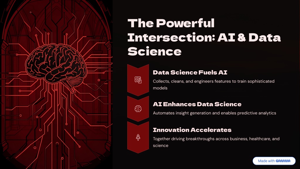 The Powerful Intersection: AI & Data Science Data Science Fuels AI Collects, cleans, and engineers features to train sophisticated models AI Enhances Data Science Automates insight generation and enables predictive analytics Innovation Accelerates Together driving breakthroughs across business, healthcare, and science