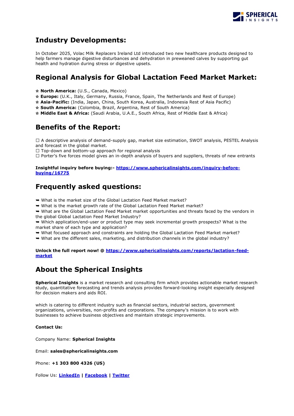 3. Industry Developments: In October 2025, Volac Milk Replacers Ireland Ltd introduced two new healthcare products designed to help farmers manage digestive disturbances and dehydration in preweaned calves by supporting gut health and hydration during stress or digestive upsets. Regional Analysis for Global Lactation Feed Market Market: ✫ ✫ North America: (U.S., Canada, Mexico) ✫ ✫ Europe: (U.K., Italy, Germany, Russia, France, Spain, The Netherlands and Rest of Europe) ✫ ✫ Asia-Pacific: (India, Japan, China, South Korea, Australia, Indonesia Rest of Asia Pacific) ✫ ✫ South America: (Colombia, Brazil, Argentina, Rest of South America) ✫ ✫ Middle East & Africa: (Saudi Arabia, U.A.E., South Africa, Rest of Middle East & Africa) Benefits of the Report: ⏩ A descriptive analysis of demand-supply gap, market size estimation, SWOT analysis, PESTEL Analysis and forecast in the global market. ⏩ Top-down and bottom-up approach for regional analysis ⏩ Porter’s five forces model gives an in-depth analysis of buyers and suppliers, threats of new entrants Insightful inquiry before buying:- https://www.sphericalinsights.com/inquiry-before- buying/16775 Frequently asked questions: ➥ What is the market size of the Global Lactation Feed Market market? ➥ What is the market growth rate of the Global Lactation Feed Market market? ➥ What are the Global Lactation Feed Market market opportunities and threats faced by the vendors in the global Global Lactation Feed Market Industry? ➥ Which application/end-user or product type may seek incremental growth prospects? What is the market share of each type and application? ➥ What focused approach and constraints are holding the Global Lactation Feed Market market? ➥ What are the different sales, marketing, and distribution channels in the global industry? Unlock the full report now! @ https://www.sphericalinsights.com/reports/lactation-feed- market About the Spherical Insights Spherical Insights is a market research and consulting firm which provides actionable market research study, quantitative forecasting and trends analysis provides forward-looking insight especially designed for decision makers and aids ROI. which is catering to different industry such as financial sectors, industrial sectors, government organizations, universities, non-profits and corporations. The company's mission is to work with businesses to achieve business objectives and maintain strategic improvements. Contact Us: Company Name: Spherical Insights Email: sales@sphericalinsights.com Phone: +1 303 800 4326 (US) Follow Us: LinkedIn | Facebook | Twitter