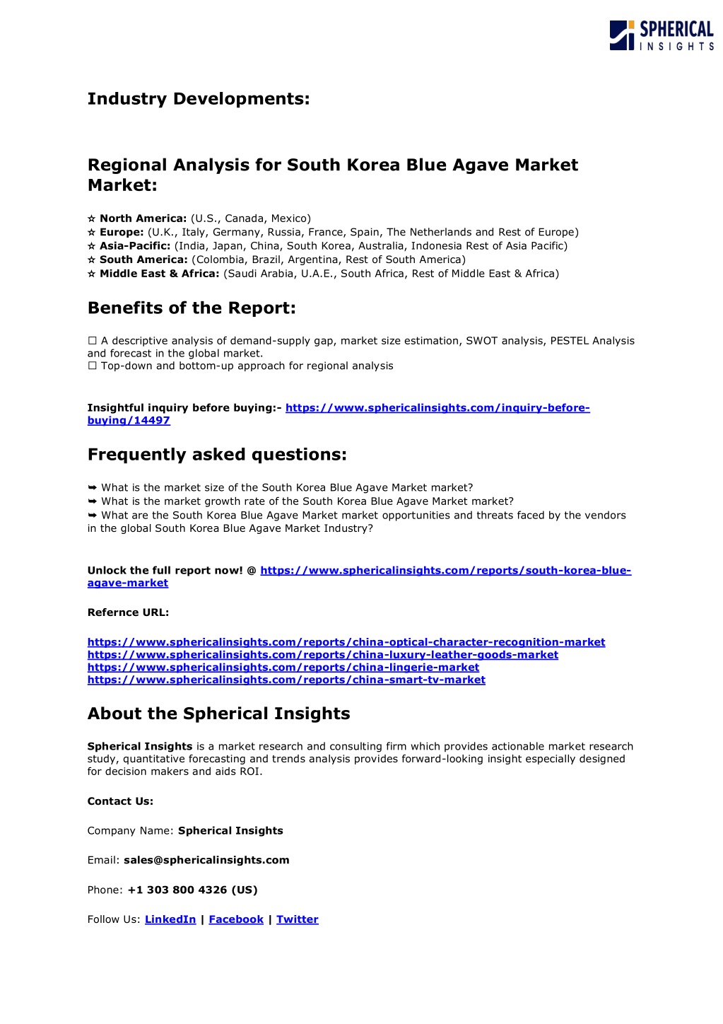 Industry Developments: Regional Analysis for South Korea Blue Agave Market Market: ✫ ✫ North America: (U.S., Canada, Mexico) ✫ ✫ Europe: (U.K., Italy, Germany, Russia, France, Spain, The Netherlands and Rest of Europe) ✫ ✫ Asia-Pacific: (India, Japan, China, South Korea, Australia, Indonesia Rest of Asia Pacific) ✫ ✫ South America: (Colombia, Brazil, Argentina, Rest of South America) ✫ ✫ Middle East & Africa: (Saudi Arabia, U.A.E., South Africa, Rest of Middle East & Africa) Benefits of the Report: ⏩ A descriptive analysis of demand-supply gap, market size estimation, SWOT analysis, PESTEL Analysis and forecast in the global market. ⏩ Top-down and bottom-up approach for regional analysis Insightful inquiry before buying:- https://www.sphericalinsights.com/inquiry-before- buying/14497 Frequently asked questions: ➥ What is the market size of the South Korea Blue Agave Market market? ➥ What is the market growth rate of the South Korea Blue Agave Market market? ➥ What are the South Korea Blue Agave Market market opportunities and threats faced by the vendors in the global South Korea Blue Agave Market Industry? Unlock the full report now! @ https://www.sphericalinsights.com/reports/south-korea-blue- agave-market Refernce URL: https://www.sphericalinsights.com/reports/china-optical-character-recognition-market https://www.sphericalinsights.com/reports/china-luxury-leather-goods-market https://www.sphericalinsights.com/reports/china-lingerie-market https://www.sphericalinsights.com/reports/china-smart-tv-market About the Spherical Insights Spherical Insights is a market research and consulting firm which provides actionable market research study, quantitative forecasting and trends analysis provides forward-looking insight especially designed for decision makers and aids ROI. Contact Us: Company Name: Spherical Insights Email: sales@sphericalinsights.com Phone: +1 303 800 4326 (US) Follow Us: LinkedIn | Facebook | Twitter