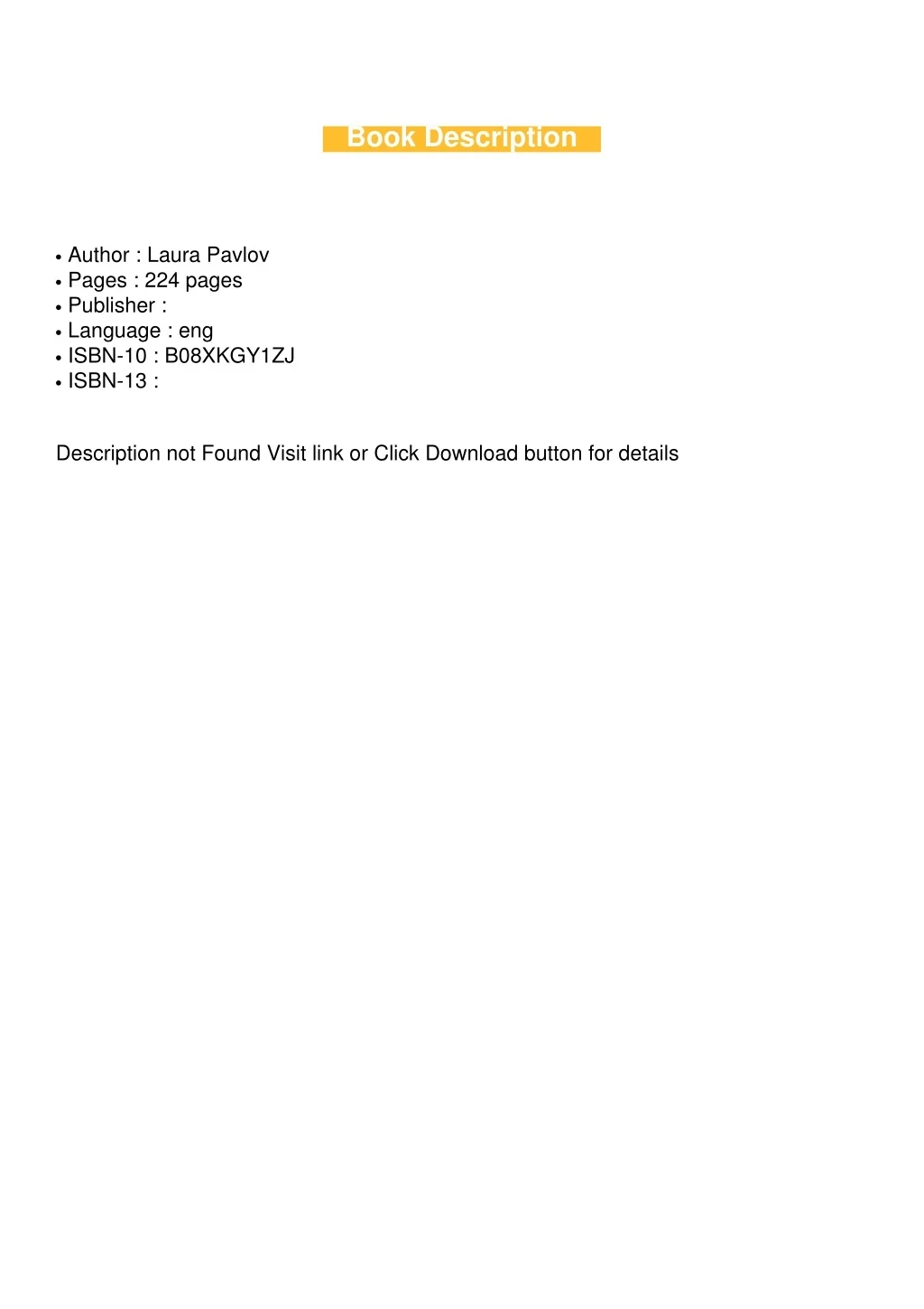 Book Description Author : Laura Pavlov Pages : 224 pages Publisher : Language : eng ISBN-10 : B08XKGY1ZJ ISBN-13 : G G G G G G Description not Found Visit link or Click Download button for details