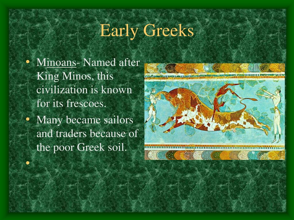 Minoans- Named after King Minos, this civilization is known for its frescoes. Many became sailors and traders because of the poor Greek soil. Early Greeks