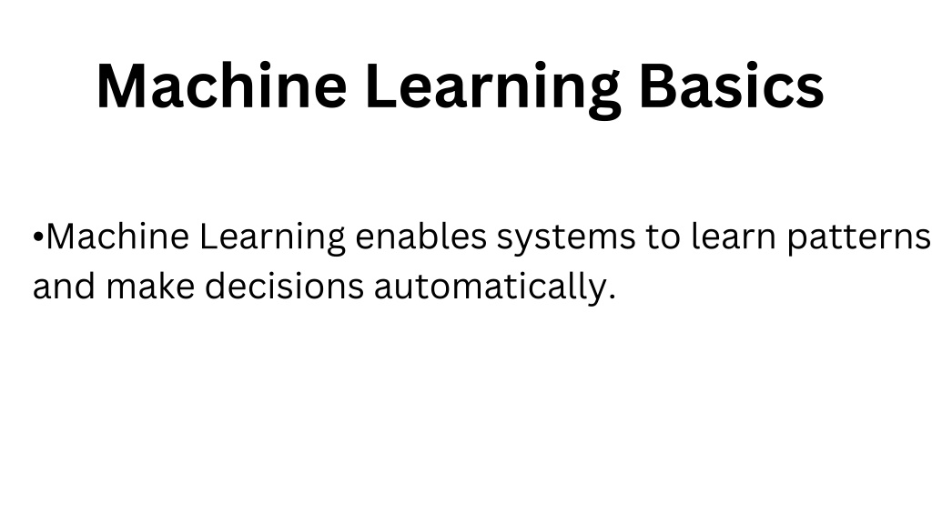 5. Machine Learning Basics •Machine Learning enables systems to learn patterns and make decisions automatically.