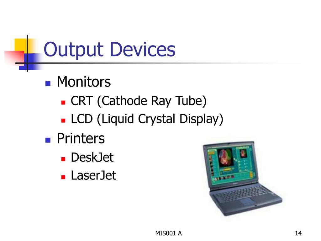 Output Devices • Monitors • CRT (Cathode Ray Tube) • LCD (Liquid Crystal Display) • Printers • DeskJet • LaserJet MIS001 A