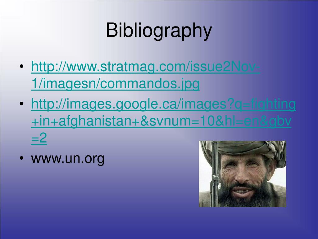Bibliography • http://www.stratmag.com/issue2Nov-1/imagesn/commandos.jpg • http://images.google.ca/images?q=fighting+in+afghanistan+&svnum=10&hl=en&gbv=2 • www.un.org