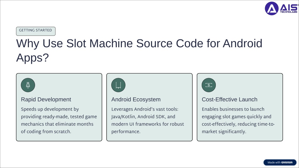 2. GETTING STARTED Why Use Slot Machine Source Code for Android Apps? Rapid Development Android Ecosystem Cost-Effective Launch Speeds up development by providing ready-made, tested game mechanics that eliminate months of coding from scratch. Leverages Android's vast tools: Java/Kotlin, Android SDK, and modern UI frameworks for robust performance. Enables businesses to launch engaging slot games quickly and cost-effectively, reducing time-to-market significantly.