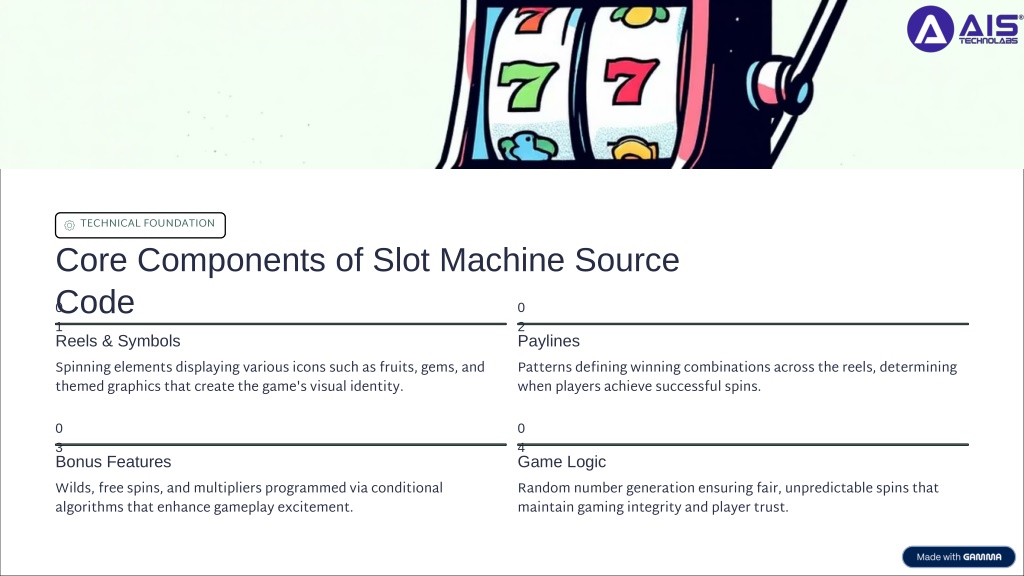 3. TECHNICAL FOUNDATION Core Components of Slot Machine Source Code 01 02 Reels & Symbols Paylines Spinning elements displaying various icons such as fruits, gems, and themed graphics that create the game's visual identity. Patterns defining winning combinations across the reels, determining when players achieve successful spins. 03 04 Bonus Features Game Logic Wilds, free spins, and multipliers programmed via conditional algorithms that enhance gameplay excitement. Random number generation ensuring fair, unpredictable spins that maintain gaming integrity and player trust.