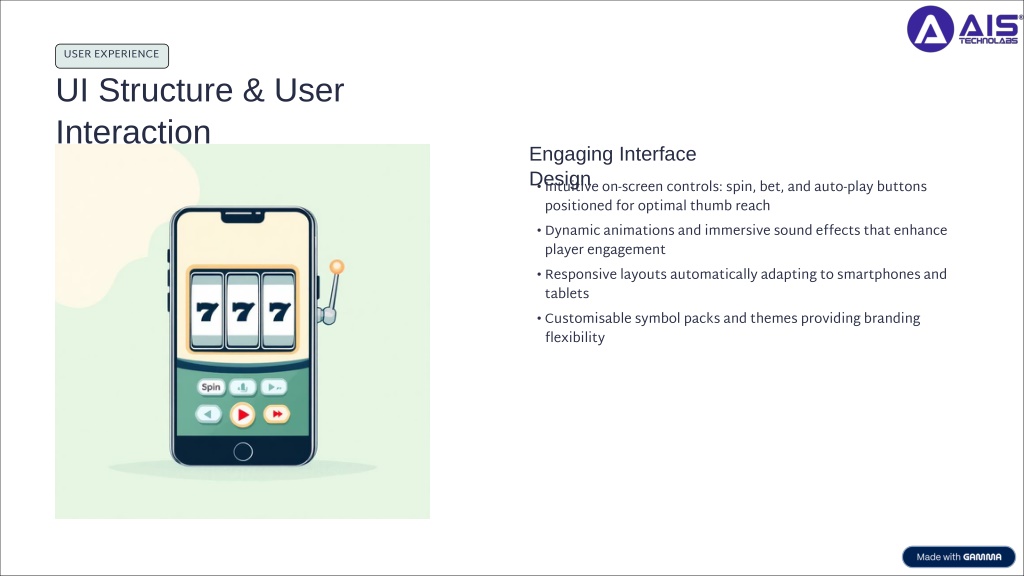 4. USER EXPERIENCE UI Structure & User Interaction Engaging Interface Design • Intuitive on-screen controls: spin, bet, and auto-play buttons positioned for optimal thumb reach • Dynamic animations and immersive sound effects that enhance player engagement • Responsive layouts automatically adapting to smartphones and tablets • Customisable symbol packs and themes providing branding flexibility