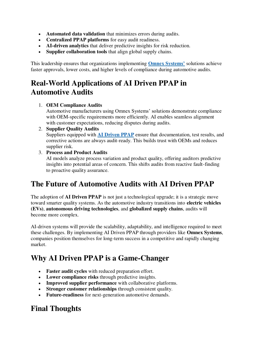 Automated data validation that minimizes errors during audits. Centralized PPAP platforms for easy audit readiness. AI-driven analytics that deliver predictive insights for risk reduction. Supplier collaboration tools that align global supply chains. This leadership ensures that organizations implementing Omnex Systems’ solutions achieve faster approvals, lower costs, and higher levels of compliance during automotive audits. Real-World Applications of AI Driven PPAP in Automotive Audits 1.OEM Compliance Audits Automotive manufacturers using Omnex Systems’ solutions demonstrate compliance with OEM-specific requirements more efficiently. AI enables seamless alignment with customer expectations, reducing disputes during audits. 2.Supplier Quality Audits Suppliers equipped with AI Driven PPAP ensure that documentation, test results, and corrective actions are always audit-ready. This builds trust with OEMs and reduces supplier risk. 3.Process and Product Audits AI models analyze process variation and product quality, offering auditors predictive insights into potential areas of concern. This shifts audits from reactive fault-finding to proactive quality assurance. The Future of Automotive Audits with AI Driven PPAP The adoption of AI Driven PPAP is not just a technological upgrade; it is a strategic move toward smarter quality systems. As the automotive industry transitions into electric vehicles (EVs), autonomous driving technologies, and globalized supply chains, audits will become more complex. AI-driven systems will provide the scalability, adaptability, and intelligence required to meet these challenges. By implementing AI Driven PPAP through providers like Omnex Systems, companies position themselves for long-term success in a competitive and rapidly changing market. Why AI Driven PPAP is a Game-Changer Faster audit cycles with reduced preparation effort. Lower compliance risks through predictive insights. Improved supplier performance with collaborative platforms. Stronger customer relationships through consistent quality. Future-readiness for next-generation automotive demands. Final Thoughts
