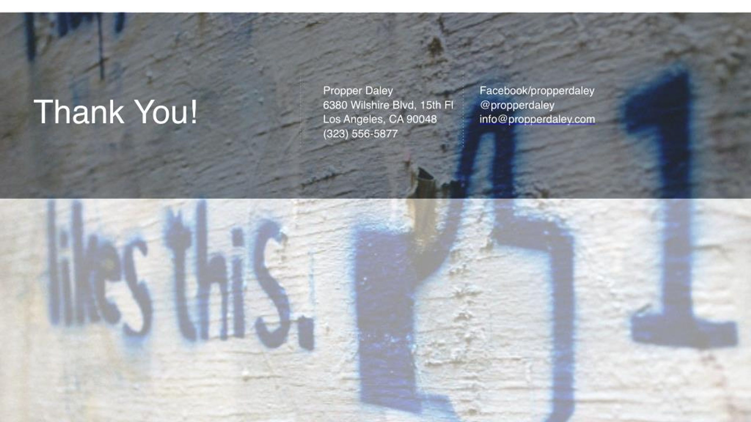 ‹#› Propper Daley 6380 Wilshire Blvd, 15th Fl Los Angeles, CA 90048 (323) 556-5877 Facebook/propperdaley @propperdaley info@propperdaley.com Thank You!