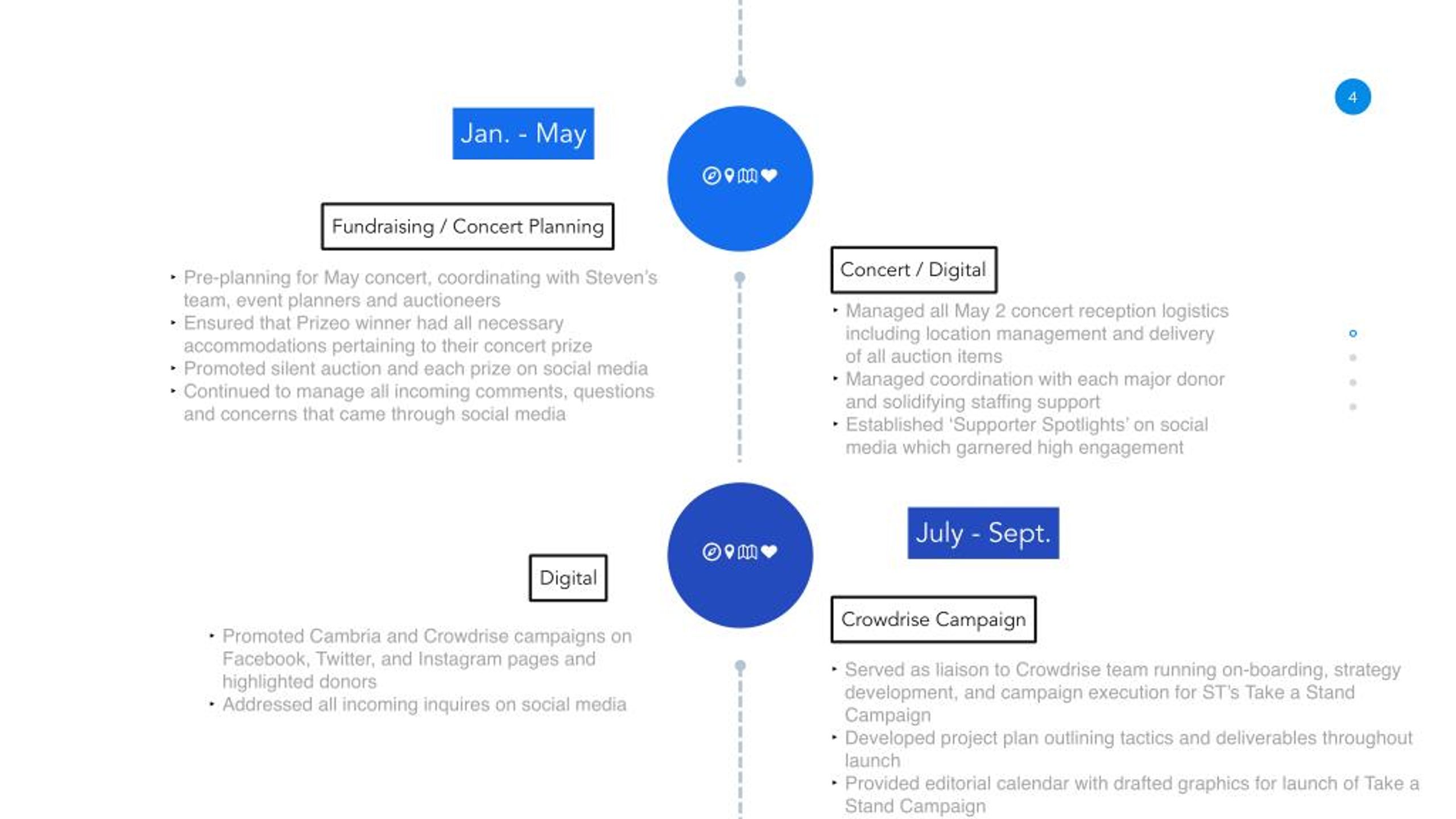 ‹#› 4 Jan. - May 2016 Fundraising / Concert Planning Concert / Digital ‣ Pre-planning for May concert, coordinating with Steven’s team, event planners and auctioneers ‣ Ensured that Prizeo winner had all necessary accommodations pertaining to their concert prize ‣ Promoted silent auction and each prize on social media ‣ Continued to manage all incoming comments, questions and concerns that came through social media ‣ Managed all May 2 concert reception logistics including location management and delivery of all auction items ‣ Managed coordination with each major donor and solidifying staffing support ‣ Established ‘Supporter Spotlights’ on social media which garnered high engagement July - Sept. 2016 Digital Crowdrise Campaign ‣ Promoted Cambria and Crowdrise campaigns on Facebook, Twitter, and Instagram pages and highlighted donors ‣ Addressed all incoming inquires on social media ‣ Served as liaison to Crowdrise team running on-boarding, strategy development, and campaign execution for ST’s Take a Stand Campaign ‣ Developed project plan outlining tactics and deliverables throughout launch ‣ Provided editorial calendar with drafted graphics for launch of Take a Stand Campaign