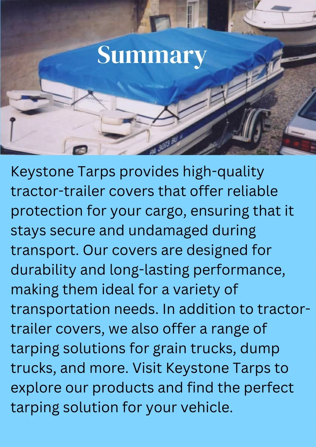 Summary Keystone Tarps provides high-quality tractor-trailer covers that offer reliable protection for your cargo, ensuring that it stays secure and undamaged during transport. Our covers are designed for durability and long-lasting performance, making them ideal for a variety of transportation needs. In addition to tractor- trailer covers, we also offer a range of tarping solutions for grain trucks, dump trucks, and more. Visit Keystone Tarps to explore our products and find the perfect tarping solution for your vehicle.