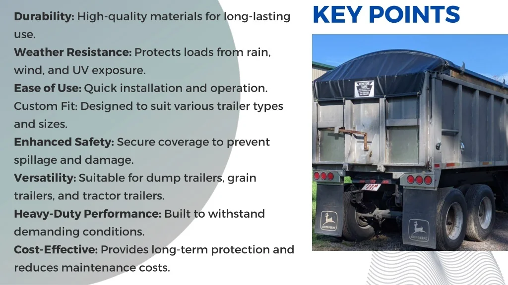 KEY POINTS Durability: High-quality materials for long-lasting use. Weather Resistance: Protects loads from rain, wind, and UV exposure. Ease of Use: Quick installation and operation. Custom Fit: Designed to suit various trailer types and sizes. Enhanced Safety: Secure coverage to prevent spillage and damage. Versatility: Suitable for dump trailers, grain trailers, and tractor trailers. Heavy-Duty Performance: Built to withstand demanding conditions. Cost-Effective: Provides long-term protection and reduces maintenance costs.