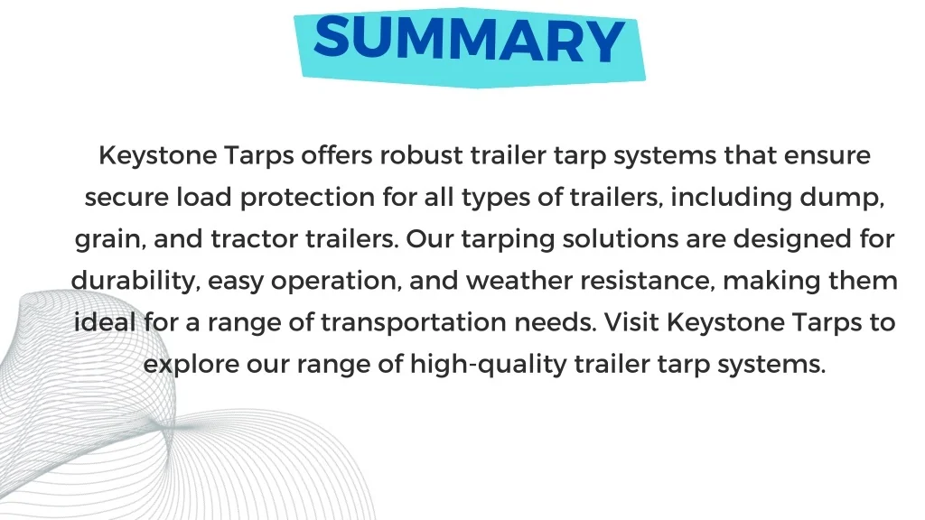 SUMMARY Keystone Tarps offers robust trailer tarp systems that ensure secure load protection for all types of trailers, including dump, grain, and tractor trailers. Our tarping solutions are designed for durability, easy operation, and weather resistance, making them ideal for a range of transportation needs. Visit Keystone Tarps to explore our range of high-quality trailer tarp systems.