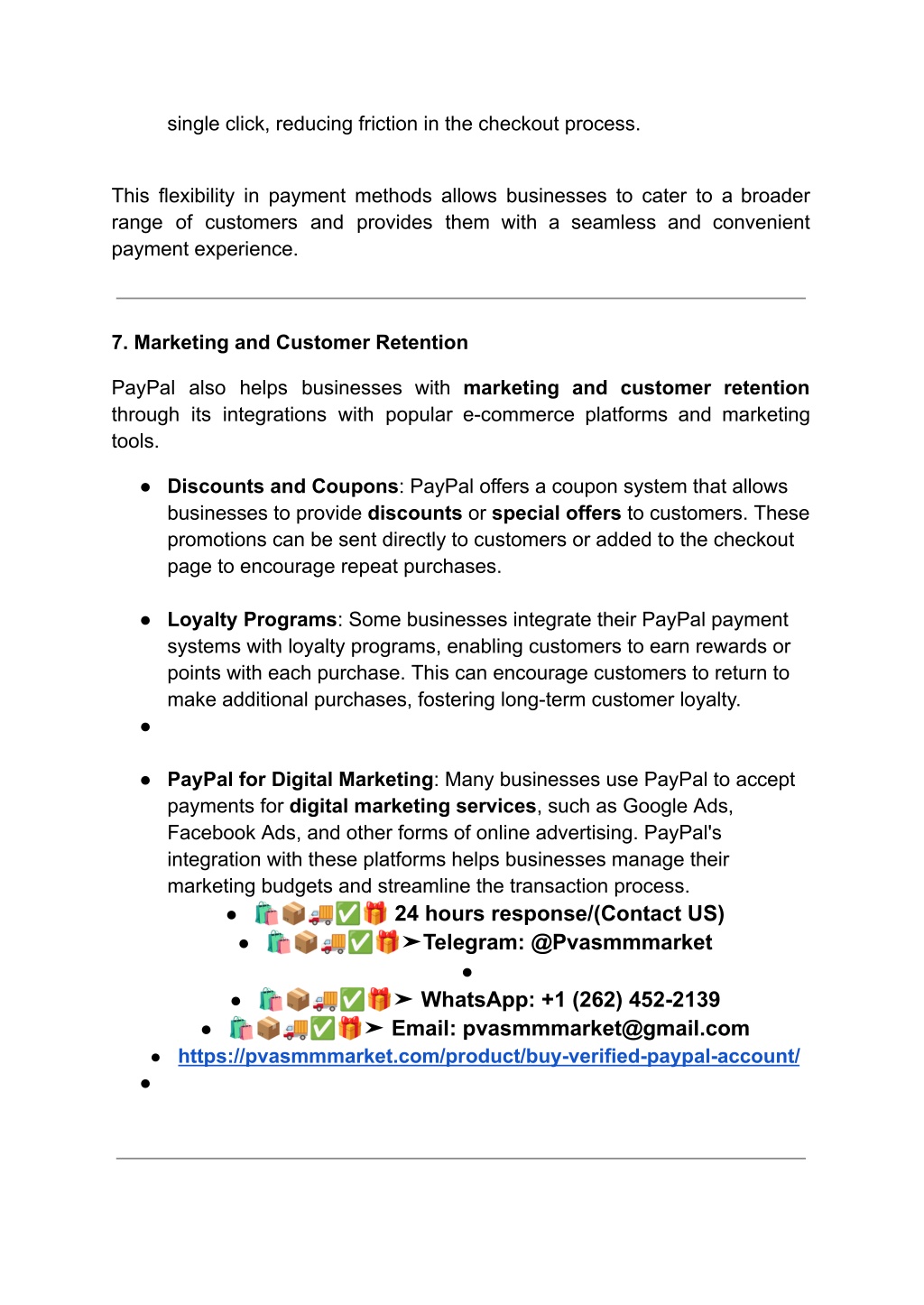single click, reducing friction in the checkout process. This flexibility in payment methods allows businesses to cater to a broader range of customers and provides them with a seamless and convenient payment experience. 7. Marketing and Customer Retention PayPal also helps businesses with marketing and customer retention through its integrations with popular e-commerce platforms and marketing tools. ● Discounts and Coupons: PayPal offers a coupon system that allows businesses to provide discounts or special offers to customers. These promotions can be sent directly to customers or added to the checkout page to encourage repeat purchases. ● Loyalty Programs: Some businesses integrate their PayPal payment systems with loyalty programs, enabling customers to earn rewards or points with each purchase. This can encourage customers to return to make additional purchases, fostering long-term customer loyalty. ● ● PayPal for Digital Marketing: Many businesses use PayPal to accept payments for digital marketing services, such as Google Ads, Facebook Ads, and other forms of online advertising. PayPal's integration with these platforms helps businesses manage their marketing budgets and streamline the transaction process. ● ???✅? 24 hours response/(Contact US) ● ???✅?➤Telegram: @Pvasmmmarket ● ● ???✅?➤ WhatsApp: +1 (262) 452-2139 ● ???✅?➤ Email: pvasmmmarket@gmail.com ● https://pvasmmmarket.com/product/buy-verified-paypal-account/ ●
