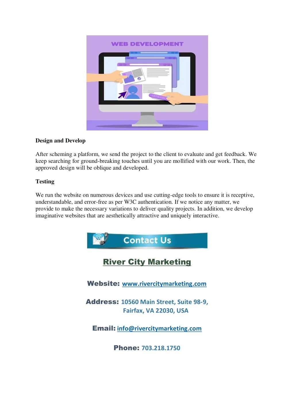 Design and Develop After scheming a platform, we send the project to the client to evaluate and get feedback. We keep searching for ground-breaking touches until you are mollified with our work. Then, the approved design will be oblique and developed. Testing We run the website on numerous devices and use cutting-edge tools to ensure it is receptive, understandable, and error-free as per W3C authentication. If we notice any matter, we provide to make the necessary variations to deliver quality projects. In addition, we develop imaginative websites that are aesthetically attractive and uniquely interactive. River City Marketing Website: www.rivercitymarketing.com Address: 10560 Main Street, Suite 98-9, Fairfax, VA 22030, USA Email:info@rivercitymarketing.com Phone: 703.218.1750