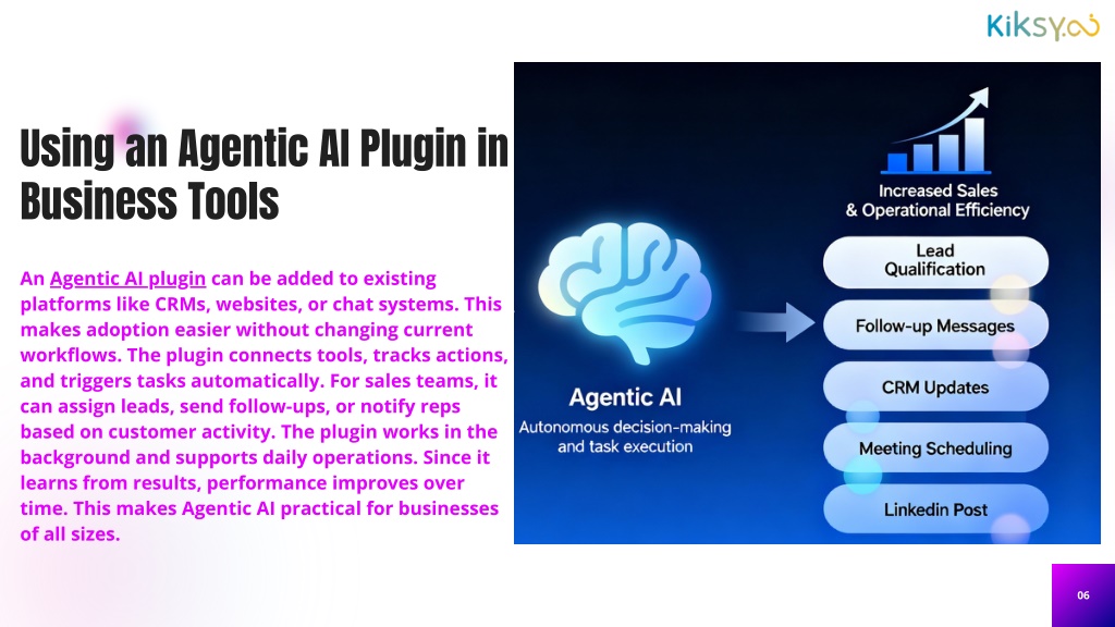 Using an Agentic AI Plugin in Business Tools An Agentic AI plugin can be added to existing platforms like CRMs, websites, or chat systems. This makes adoption easier without changing current workflows. The plugin connects tools, tracks actions, and triggers tasks automatically. For sales teams, it can assign leads, send follow-ups, or notify reps based on customer activity. The plugin works in the background and supports daily operations. Since it learns from results, performance improves over time. This makes Agentic AI practical for businesses of all sizes. 06