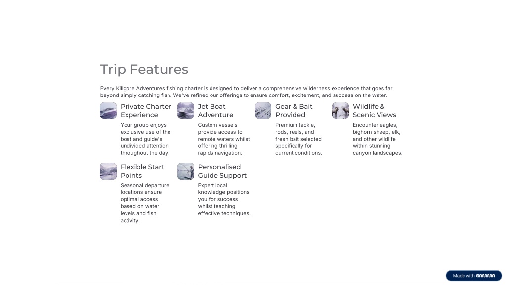 Trip Features Every Killgore Adventures fishing charter is designed to deliver a comprehensive wilderness experience that goes far beyond simply catching fish. We've refined our offerings to ensure comfort, excitement, and success on the water. Private Charter Experience Jet Boat Adventure Gear & Bait Provided Wildlife & Scenic Views Your group enjoys exclusive use of the boat and guide's undivided attention throughout the day. Custom vessels provide access to remote waters whilst offering thrilling rapids navigation. Premium tackle, rods, reels, and fresh bait selected specifically for current conditions. Encounter eagles, bighorn sheep, elk, and other wildlife within stunning canyon landscapes. Flexible Start Points Personalised Guide Support Seasonal departure locations ensure optimal access based on water levels and fish activity. Expert local knowledge positions you for success whilst teaching effective techniques.