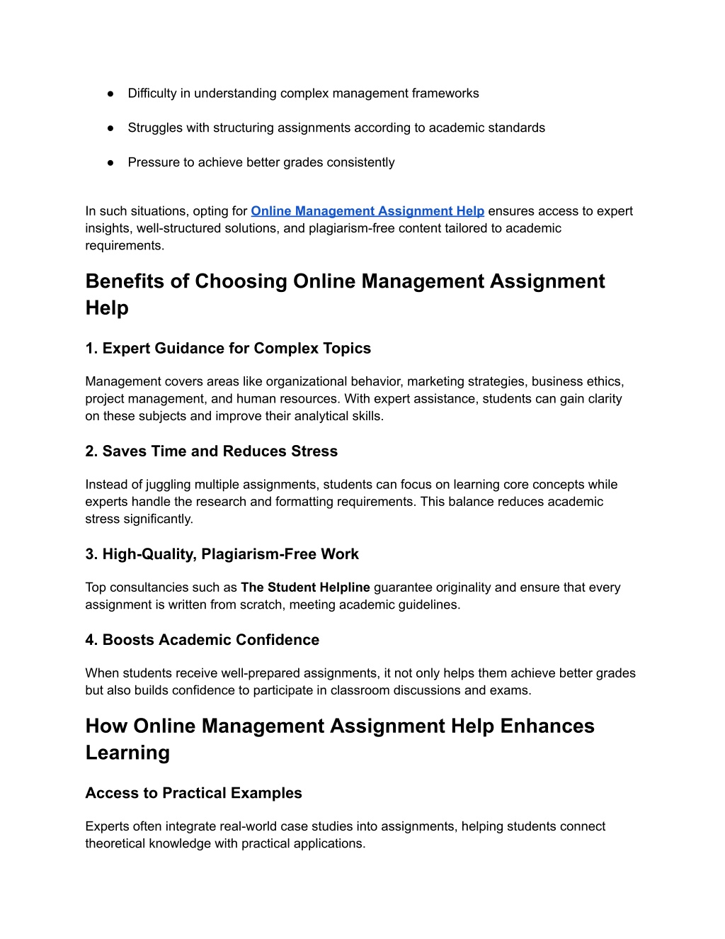 ● Difficulty in understanding complex management frameworks ● Struggles with structuring assignments according to academic standards ● Pressure to achieve better grades consistently In such situations, opting for Online Management Assignment Help ensures access to expert insights, well-structured solutions, and plagiarism-free content tailored to academic requirements. Benefits of Choosing Online Management Assignment Help 1. Expert Guidance for Complex Topics Management covers areas like organizational behavior, marketing strategies, business ethics, project management, and human resources. With expert assistance, students can gain clarity on these subjects and improve their analytical skills. 2. Saves Time and Reduces Stress Instead of juggling multiple assignments, students can focus on learning core concepts while experts handle the research and formatting requirements. This balance reduces academic stress significantly. 3. High-Quality, Plagiarism-Free Work Top consultancies such as The Student Helpline guarantee originality and ensure that every assignment is written from scratch, meeting academic guidelines. 4. Boosts Academic Confidence When students receive well-prepared assignments, it not only helps them achieve better grades but also builds confidence to participate in classroom discussions and exams. How Online Management Assignment Help Enhances Learning Access to Practical Examples Experts often integrate real-world case studies into assignments, helping students connect theoretical knowledge with practical applications.