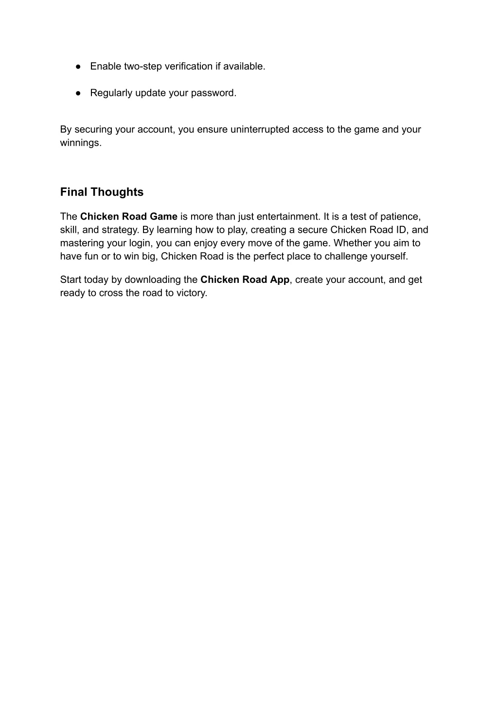 ● Enable two-step verification if available. ● Regularly update your password. By securing your account, you ensure uninterrupted access to the game and your winnings. Final Thoughts The Chicken Road Game is more than just entertainment. It is a test of patience, skill, and strategy. By learning how to play, creating a secure Chicken Road ID, and mastering your login, you can enjoy every move of the game. Whether you aim to have fun or to win big, Chicken Road is the perfect place to challenge yourself. Start today by downloading the Chicken Road App, create your account, and get ready to cross the road to victory.