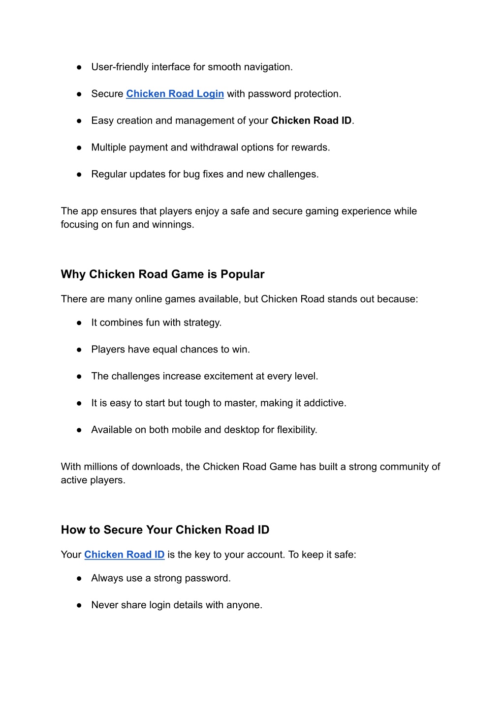 ● User-friendly interface for smooth navigation. ● Secure Chicken Road Login with password protection. ● Easy creation and management of your Chicken Road ID. ● Multiple payment and withdrawal options for rewards. ● Regular updates for bug fixes and new challenges. The app ensures that players enjoy a safe and secure gaming experience while focusing on fun and winnings. Why Chicken Road Game is Popular There are many online games available, but Chicken Road stands out because: ● It combines fun with strategy. ● Players have equal chances to win. ● The challenges increase excitement at every level. ● It is easy to start but tough to master, making it addictive. ● Available on both mobile and desktop for flexibility. With millions of downloads, the Chicken Road Game has built a strong community of active players. How to Secure Your Chicken Road ID Your Chicken Road ID is the key to your account. To keep it safe: ● Always use a strong password. ● Never share login details with anyone.
