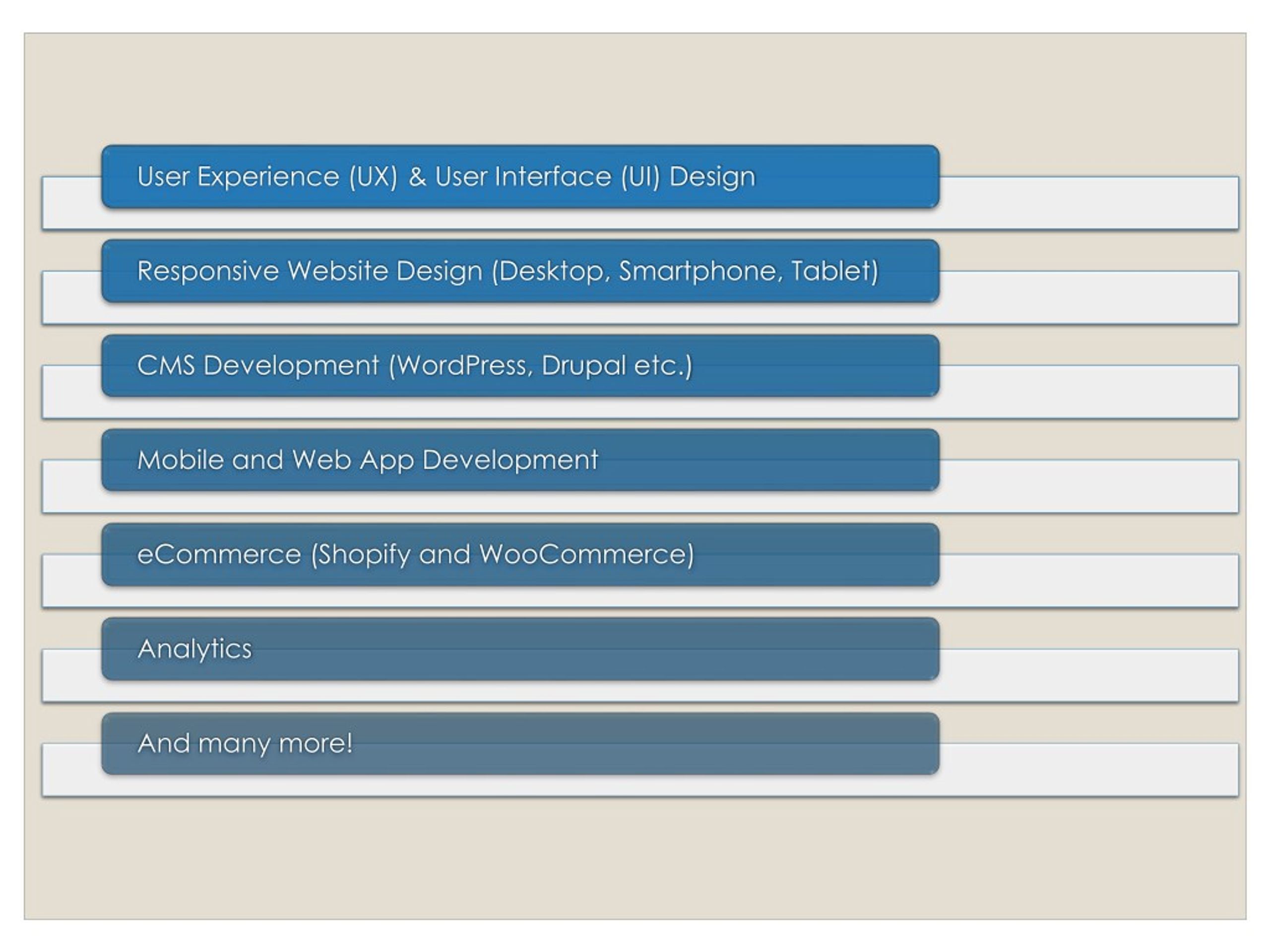 User Experience (UX) & User Interface (UI) Design Responsive Website Design (Desktop, Smartphone, Tablet) CMS Development (WordPress, Drupal etc.) Mobile and Web App Development eCommerce (Shopify and WooCommerce) Analytics And many more!