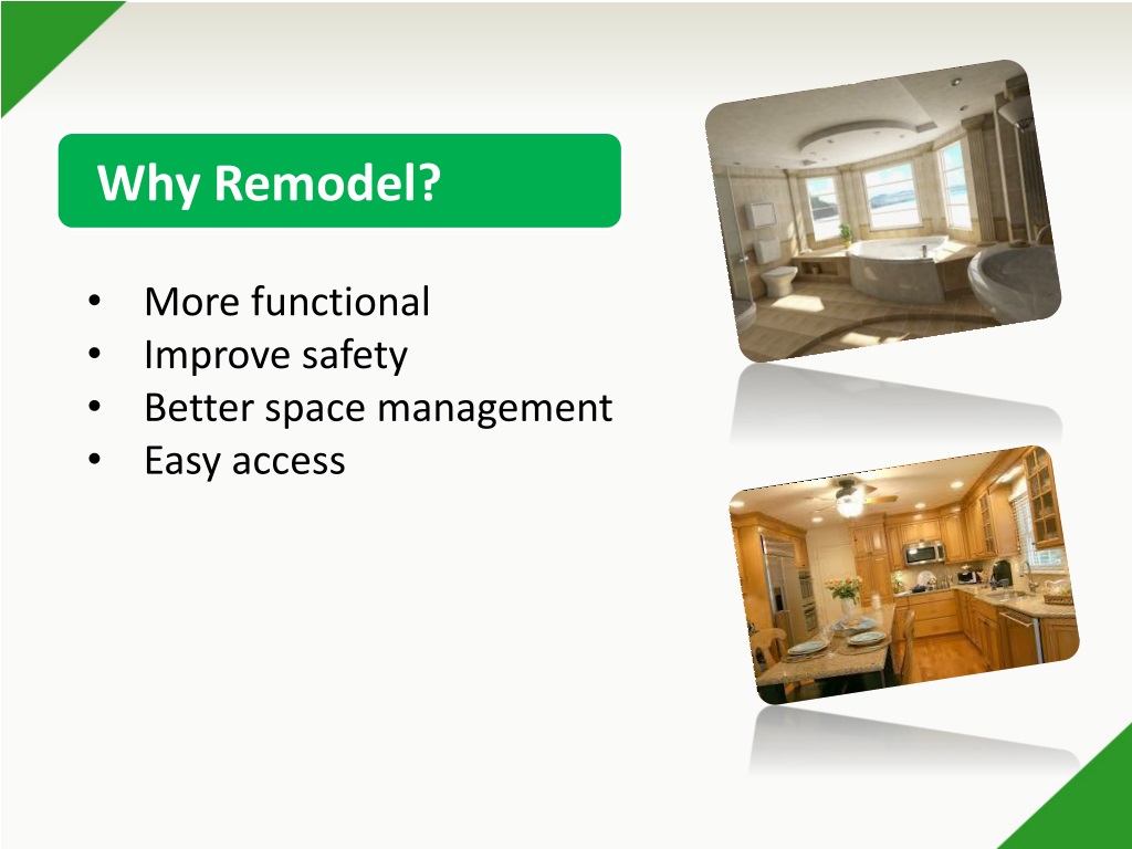 Why Remodel? • More functional • Improve safety • Better space management • Easy access