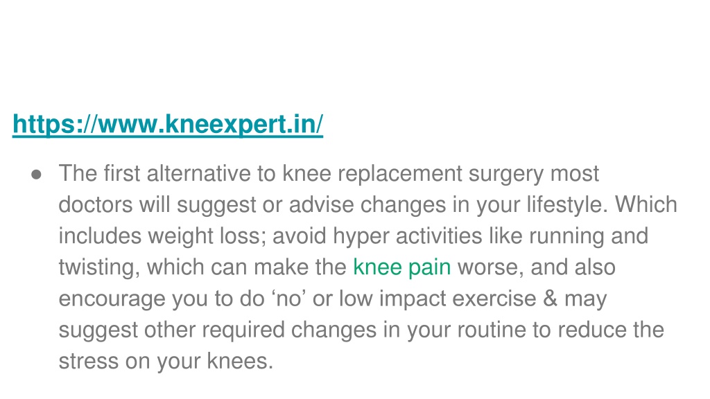 https://www.kneexpert.in/ The first alternative to knee replacement surgery most doctors will suggest or advise changes in your lifestyle. Which includes weight loss; avoid hyper activities like running and twisting, which can make the knee pain worse, and also encourage you to do ‘no’ or low impact exercise & may suggest other required changes in your routine to reduce the stress on your knees.