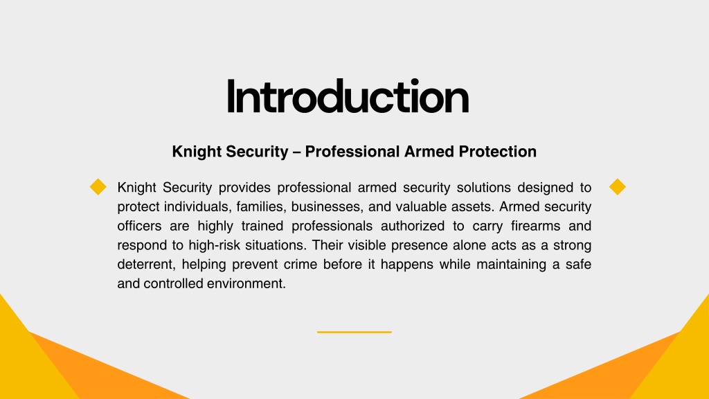 Introduction Knight Security – Professional Armed Protection Knight Security provides professional armed security solutions designed to protect individuals, families, businesses, and valuable assets. Armed security officers are highly trained professionals authorized to carry firearms and respond to high-risk situations. Their visible presence alone acts as a strong deterrent, helping prevent crime before it happens while maintaining a safe and controlled environment.