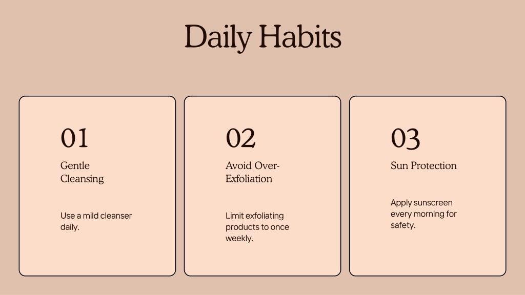 4. 01 • 02 • 03 • Daily Habits • Gentle Cleansing • Avoid Over-Exfoliation • Sun Protection • Apply sunscreen every morning for safety. • Use a mild cleanser daily. • Limit exfoliating products to once weekly.