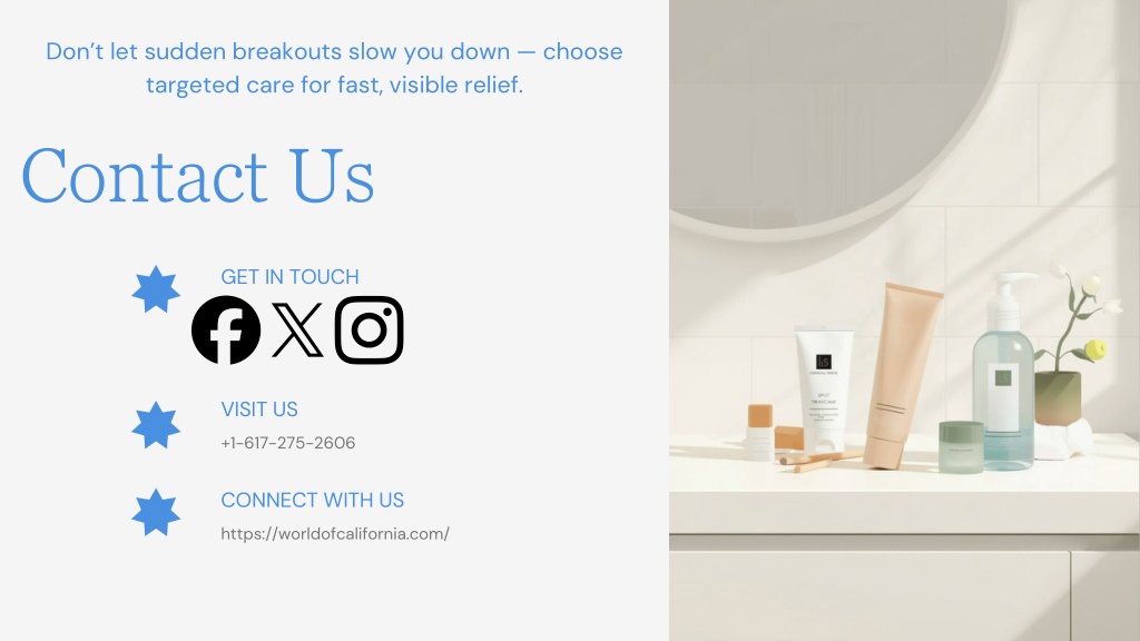 CONNECT WITH US • VISIT US • GET IN TOUCH Don’t let sudden breakouts slow you down — choose targeted care for fast, visible relief. • https://worldofcalifornia.com/ • +1-617-275-2606 • Contact Us