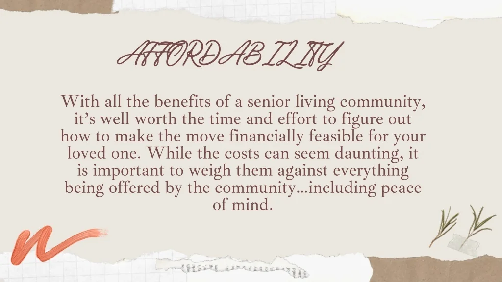 AFFORDABILITY With all the benefits of a senior living community, it’s well worth the time and effort to figure out how to make the move financially feasible for your loved one. While the costs can seem daunting, it is important to weigh them against everything being offered by the community…including peace of mind.