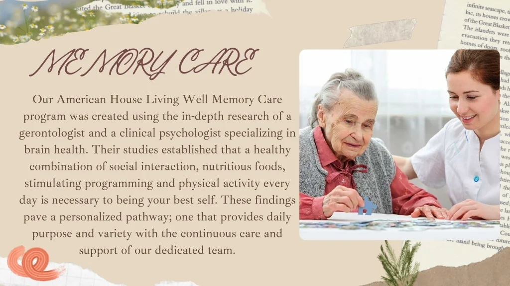 MEMORY CARE Our American House Living Well Memory Care program was created using the in-depth research of a gerontologist and a clinical psychologist specializing in brain health. Their studies established that a healthy combination of social interaction, nutritious foods, stimulating programming and physical activity every day is necessary to being your best self. These findings pave a personalized pathway; one that provides daily purpose and variety with the continuous care and support of our dedicated team.