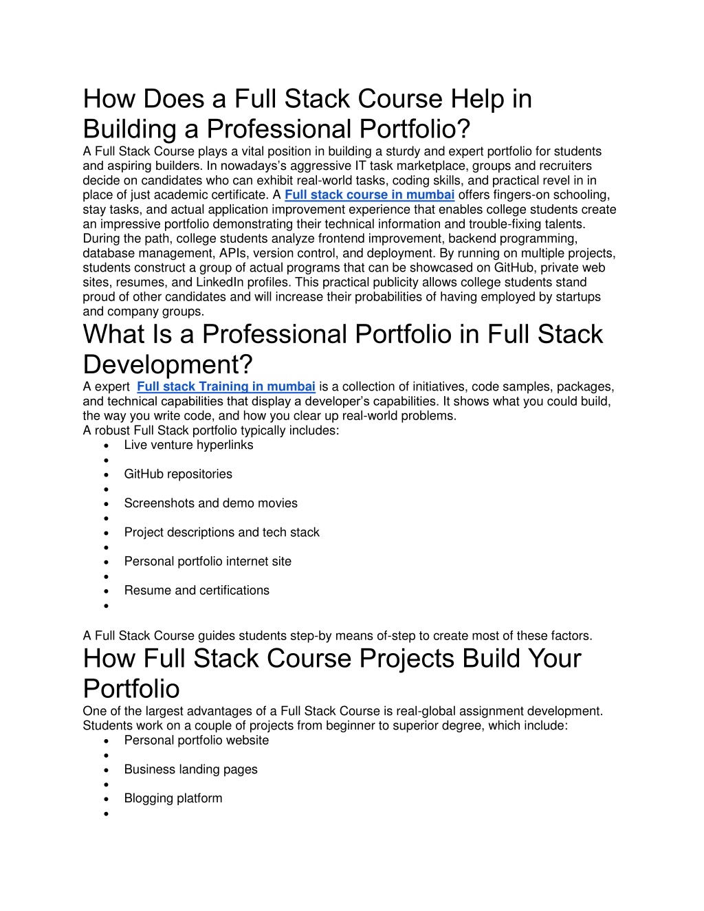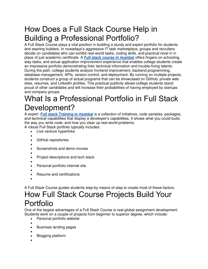 Improves salary negotiation energy Builds private emblem as a developer Helps in internships and placements Attracts freelance and faraway paintings possibilities Demonstrates sensible experience and coding capabilities Makes resume more powerful and surprising Why Recruiters Prefer Portfolio-Based Candidates Recruiters prefer applicants with portfolios because: They can see actual coding competencies in preference to just certificates Projects prove practical information and revel in GitHub suggests coding satisfactory and collaboration ability Live packages display trouble-fixing capabilities Portfolios show creativity, UI/UX understanding, and professionalism A Full Stack Course guarantees college students have multiple portfolio projects earlier than completing the training. Conclusion A Full Stack Course is one of the exceptional approaches to construct a expert portfolio that showcases actual-global development competencies. Through palms-on initiatives, GitHub repositories, private web sites, live deployments, and industry revel in, college students create a strong portfolio that draws recruiters and clients. A nicely-established Full Stack portfolio demonstrates technical expertise, problem-fixing ability, and expert readiness, making students particularly employable in startups, company corporations, and freelance markets.
