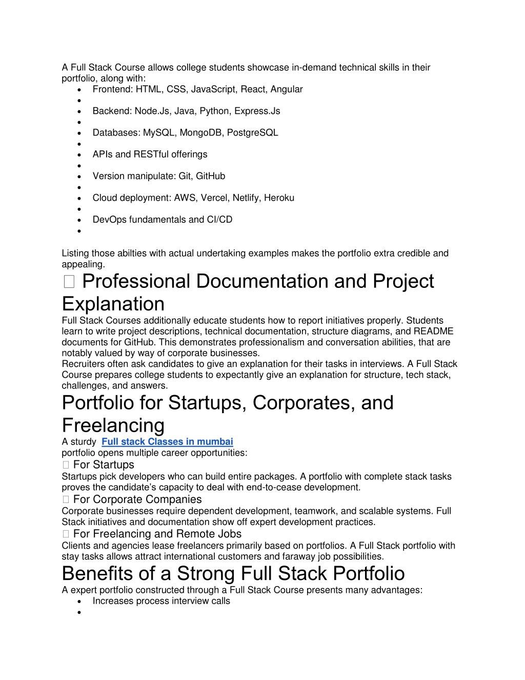 A Full Stack Course allows college students showcase in-demand technical skills in their portfolio, along with: Frontend: HTML, CSS, JavaScript, React, Angular Backend: Node.Js, Java, Python, Express.Js Databases: MySQL, MongoDB, PostgreSQL APIs and RESTful offerings Version manipulate: Git, GitHub Cloud deployment: AWS, Vercel, Netlify, Heroku DevOps fundamentals and CI/CD Listing those abilties with actual undertaking examples makes the portfolio extra credible and appealing. ✅ Professional Documentation and Project Explanation Full Stack Courses additionally educate students how to report initiatives properly. Students learn to write project descriptions, technical documentation, structure diagrams, and README documents for GitHub. This demonstrates professionalism and conversation abilities, that are notably valued by way of corporate businesses. Recruiters often ask candidates to give an explanation for their tasks in interviews. A Full Stack Course prepares college students to expectantly give an explanation for structure, tech stack, challenges, and answers. Portfolio for Startups, Corporates, and Freelancing A sturdy Full stack Classes in mumbai portfolio opens multiple career opportunities: ✅ For Startups Startups pick developers who can build entire packages. A portfolio with complete stack tasks proves the candidate’s capacity to deal with end-to-cease development. ✅ For Corporate Companies Corporate businesses require dependent development, teamwork, and scalable systems. Full Stack initiatives and documentation show off expert development practices. ✅ For Freelancing and Remote Jobs Clients and agencies lease freelancers primarily based on portfolios. A Full Stack portfolio with stay tasks allows attract international customers and faraway job possibilities. Benefits of a Strong Full Stack Portfolio A expert portfolio constructed through a Full Stack Course presents many advantages: Increases process interview calls