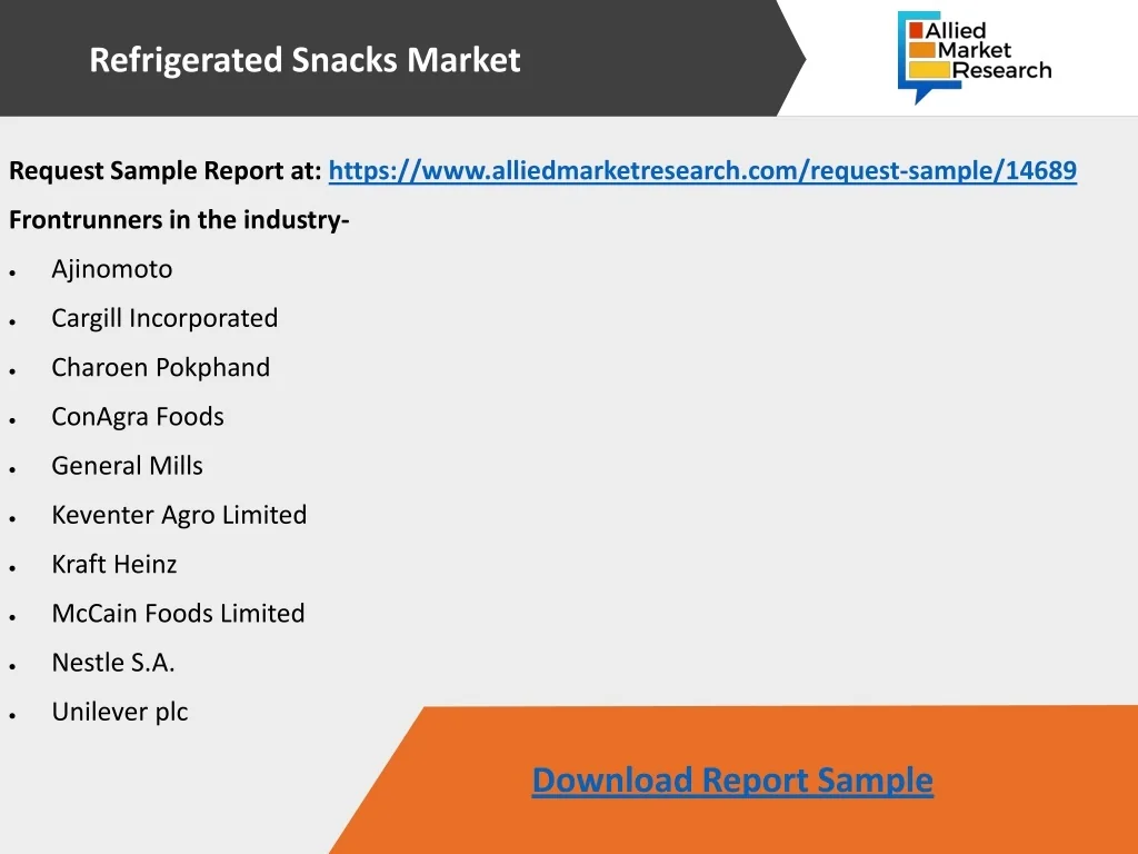 Request Sample Report at: https://www.alliedmarketresearch.com/request-sample/14689 • Frontrunners in the industry- • Ajinomoto • Cargill Incorporated • Charoen Pokphand • ConAgra Foods • General Mills • Keventer Agro Limited • Kraft Heinz • McCain Foods Limited • Nestle S.A. • Unilever plc • Refrigerated Snacks Market Download Report Sample