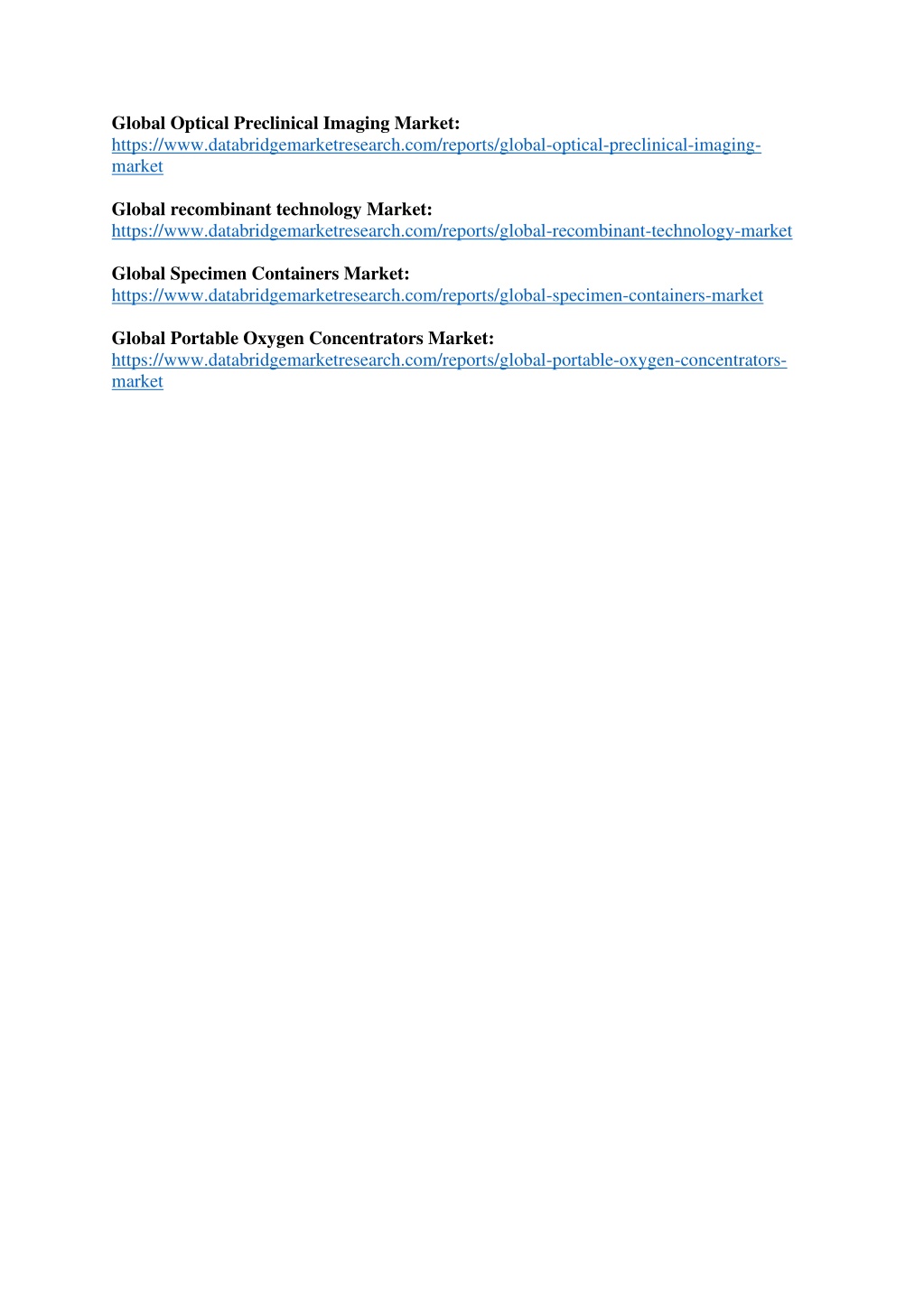 Global Optical Preclinical Imaging Market: https://www.databridgemarketresearch.com/reports/global-optical-preclinical-imaging- market Global recombinant technology Market: https://www.databridgemarketresearch.com/reports/global-recombinant-technology-market Global Specimen Containers Market: https://www.databridgemarketresearch.com/reports/global-specimen-containers-market Global Portable Oxygen Concentrators Market: https://www.databridgemarketresearch.com/reports/global-portable-oxygen-concentrators- market