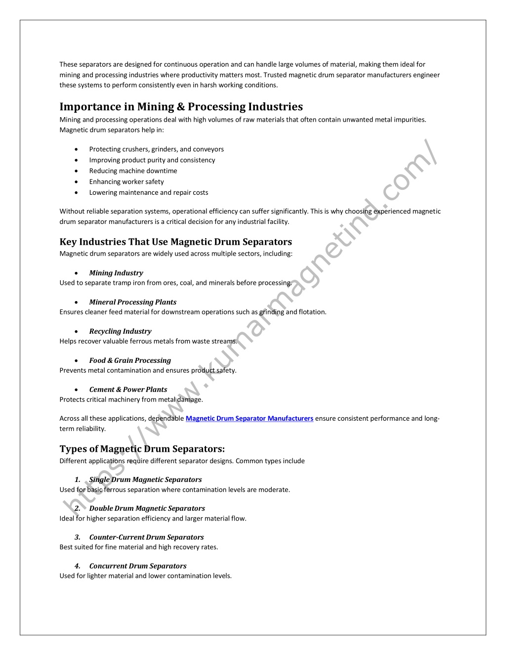 Choosing the Right Manufacturing Partner Selecting the right manufacturer is very important in selecting the best manufacturer. It is about technical expertise, industry experience, and after-sales support. Reliable magnetic drum separator manufacturers work closely with clients to understand their operational challenges and provide solutions that deliver real value. A trusted partner like Kumar Magnet focuses on long-term relationships by offering dependable products, technical guidance, and responsive service. Final Thoughts Magnetic drum separators are an essential part of mining and processing operations, helping industries maintain product quality, protect machinery, and improve efficiency. By working with experienced magnetic drum separator manufacturers, businesses can ensure smooth operations and long-term success. If you are looking to improve material purity, protect your equipment, and boost operational efficiency, now is the time to invest in high-quality magnetic drum separators. Partner with an experienced manufacturer who understands your industry needs and delivers solutions you can trust. Get in touch with Kumar Magnet today and take your separation process to the next level. Visit Us For More Details: Contact Us At:91-8000202090 E-mail Us At: kumarmagnet@outlook.com Our website: https://www.kumarmagnetind.com/
