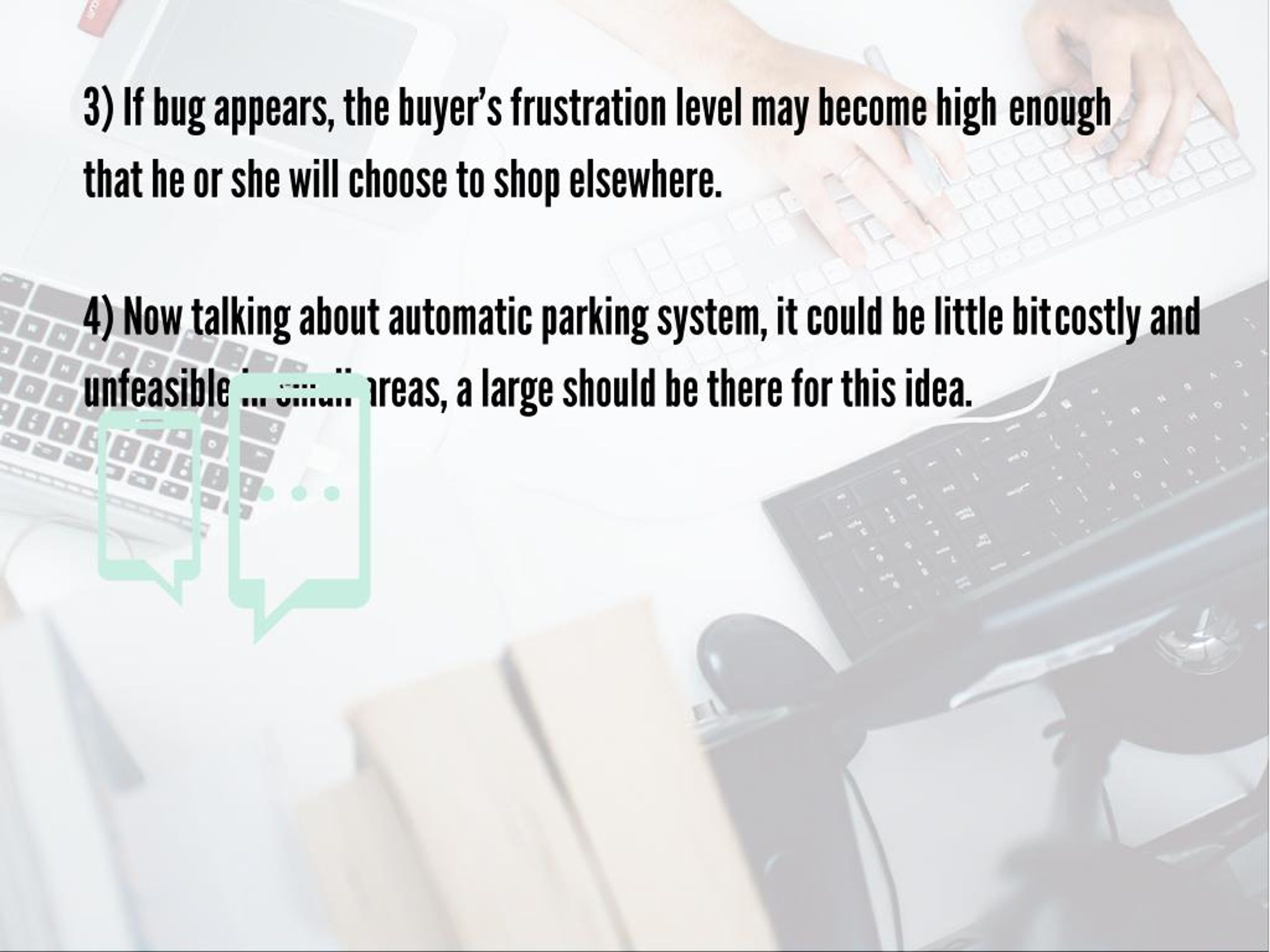 8. 3) If bug appears, the buyer’s frustration level may become high enough that he or she will choose to shop elsewhere. 4) Now talking about automatic parking system, it could be little bit costly and unfeasible in small areas, a large should be there for this idea.