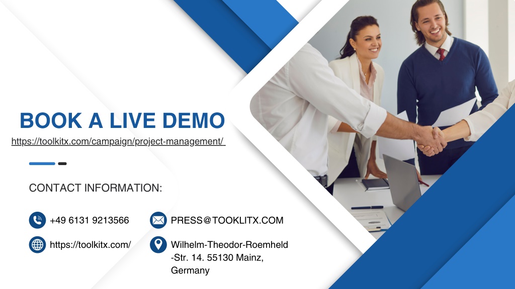 8. BOOK A LIVE DEMO https://toolkitx.com/campaign/project-management/ CONTACT INFORMATION: +49 6131 9213566 PRESS@TOOKLITX.COM Wilhelm‑Theodor‑Roemheld ‑Str. 14. 55130 Mainz, Germany https://toolkitx.com/
