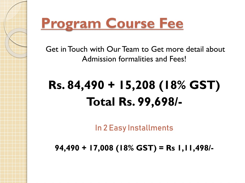 Program Course Fee Get in Touch with Our Team to Get more detail about Admission formalities and Fees! Rs. 84,490 + 15,208 (18% GST) Total Rs. 99,698/- In 2 Easy Installments 94,490 + 17,008 (18% GST) = Rs 1,11,498/-