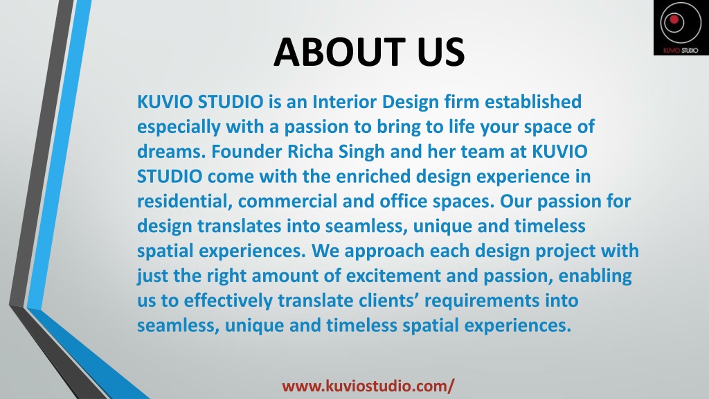ABOUT US KUVIO STUDIO is an Interior Design firm established especially with a passion to bring to life your space of dreams. Founder Richa Singh and her team at KUVIO STUDIO come with the enriched design experience in residential, commercial and office spaces. Our passion for design translates into seamless, unique and timeless spatial experiences. We approach each design project with just the right amount of excitement and passion, enabling us to effectively translate clients’ requirements into seamless, unique and timeless spatial experiences. www.kuviostudio.com/