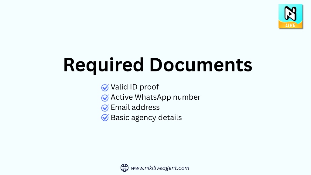 Required Documents Valid ID proof Active WhatsApp number Email address Basic agency details www.nikiliveagent.com