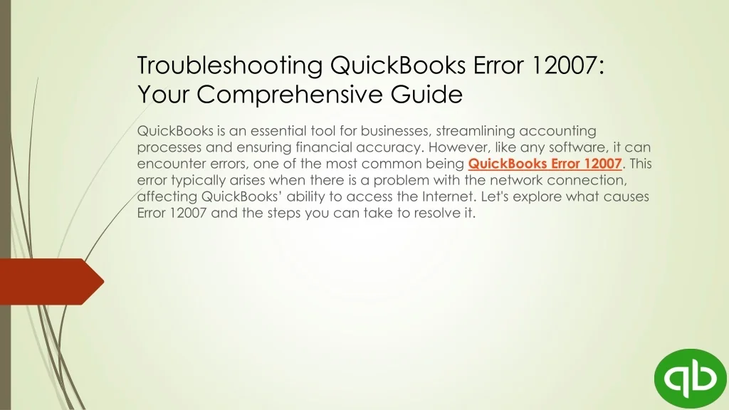 Understanding QuickBooks Error 12007 Error 12007 in QuickBooks usually occurs during an update of the QuickBooks software or payroll service. This error is primarily linked to connectivity issues, where QuickBooks cannot access the server due to internet problems. The error message might read something like: "QuickBooks has encountered a problem and needs to close."
