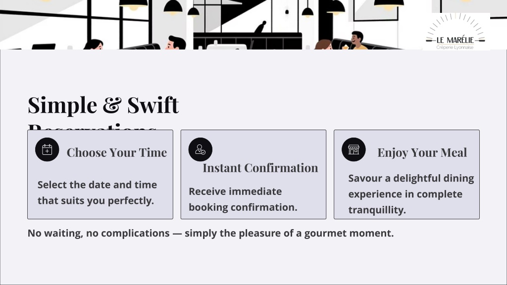 Simple & Swift Reservations Choose Your Time Enjoy Your Meal Instant Confirmation Savour a delightful dining experience in complete tranquillity. Select the date and time that suits you perfectly. Receive immediate booking confirmation. No waiting, no complications — simply the pleasure of a gourmet moment.
