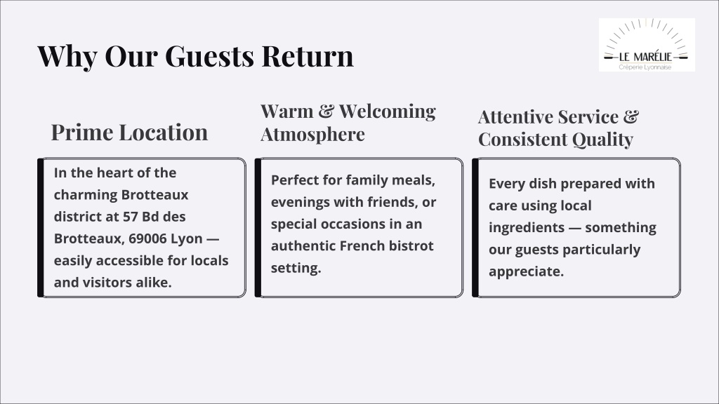 Why Our Guests Return Warm & Welcoming Atmosphere Attentive Service & Consistent Quality Prime Location In the heart of the charming Brotteaux district at 57 Bd des Brotteaux, 69006 Lyon — easily accessible for locals and visitors alike. Perfect for family meals, evenings with friends, or special occasions in an authentic French bistrot setting. Every dish prepared with care using local ingredients — something our guests particularly appreciate.