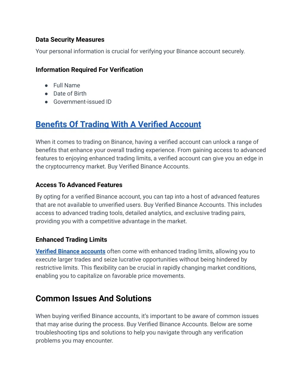 Data Security Measures Your personal information is crucial for verifying your Binance account securely. Information Required For Verification ● Full Name ● Date of Birth ● Government-issued ID Benefits Of Trading With A Verified Account When it comes to trading on Binance, having a verified account can unlock a range of benefits that enhance your overall trading experience. From gaining access to advanced features to enjoying enhanced trading limits, a verified account can give you an edge in the cryptocurrency market. Buy Verified Binance Accounts. Access To Advanced Features By opting for a verified Binance account, you can tap into a host of advanced features that are not available to unverified users. Buy Verified Binance Accounts. This includes access to advanced trading tools, detailed analytics, and exclusive trading pairs, providing you with a competitive advantage in the market. Enhanced Trading Limits Verified Binance accounts often come with enhanced trading limits, allowing you to execute larger trades and seize lucrative opportunities without being hindered by restrictive limits. This flexibility can be crucial in rapidly changing market conditions, enabling you to capitalize on favorable price movements. Common Issues And Solutions When buying verified Binance accounts, it’s important to be aware of common issues that may arise during the process. Buy Verified Binance Accounts. Below are some troubleshooting tips and solutions to help you navigate through any verification problems you may encounter.