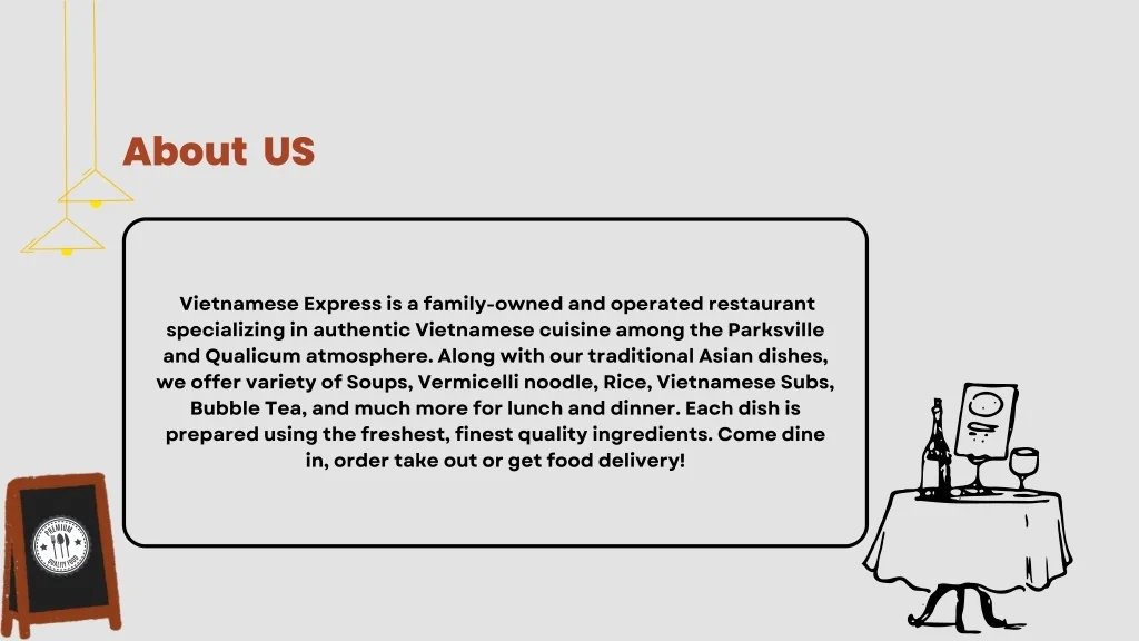 About US Vietnamese Express is a family-owned and operated restaurant specializing in authentic Vietnamese cuisine among the Parksville and Qualicum atmosphere. Along with our traditional Asian dishes, we offer variety of Soups, Vermicelli noodle, Rice, Vietnamese Subs, Bubble Tea, and much more for lunch and dinner. Each dish is prepared using the freshest, finest quality ingredients. Come dine in, order take out or get food delivery!