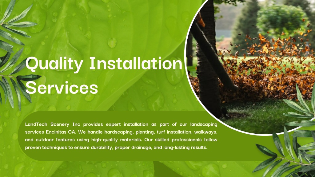 4. Quality Installation Services LandTech Scenery Inc provides expert installation as part of our landscaping services Encinitas CA. We handle hardscaping, planting, turf installation, walkways, and outdoor features using high-quality materials. Our skilled professionals follow proven techniques to ensure durability, proper drainage, and long-lasting results.