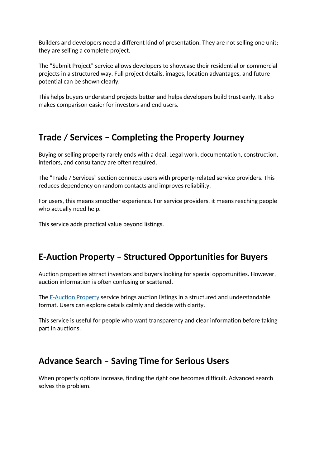 Builders and developers need a different kind of presentation. They are not selling one unit; they are selling a complete project. The “Submit Project” service allows developers to showcase their residential or commercial projects in a structured way. Full project details, images, location advantages, and future potential can be shown clearly. This helps buyers understand projects better and helps developers build trust early. It also makes comparison easier for investors and end users. Trade / Services – Completing the Property Journey Buying or selling property rarely ends with a deal. Legal work, documentation, construction, interiors, and consultancy are often required. The “Trade / Services” section connects users with property-related service providers. This reduces dependency on random contacts and improves reliability. For users, this means smoother experience. For service providers, it means reaching people who actually need help. This service adds practical value beyond listings. E-Auction Property – Structured Opportunities for Buyers Auction properties attract investors and buyers looking for special opportunities. However, auction information is often confusing or scattered. The E-Auction Property service brings auction listings in a structured and understandable format. Users can explore details calmly and decide with clarity. This service is useful for people who want transparency and clear information before taking part in auctions. Advance Search – Saving Time for Serious Users When property options increase, finding the right one becomes difficult. Advanced search solves this problem.