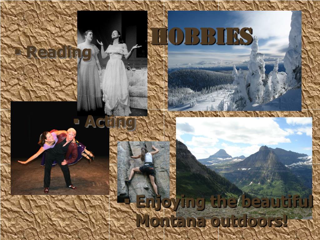 Hobbies • Reading • Enjoying the beautiful Montana outdoors! • Acting